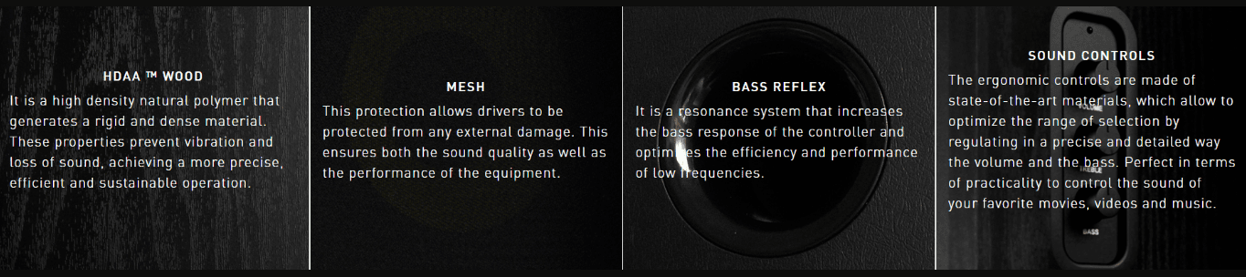 Thiết kế thùng loa Bass Reflex (có lỗ thông hơi) nhằm tăng cường đáp ứng tiếng bass và tối ưu hiệu năng và khả năng trình diễn của dải tần số thấp, cho tiếng bass sâu, chắc, mạnh mẽ.
